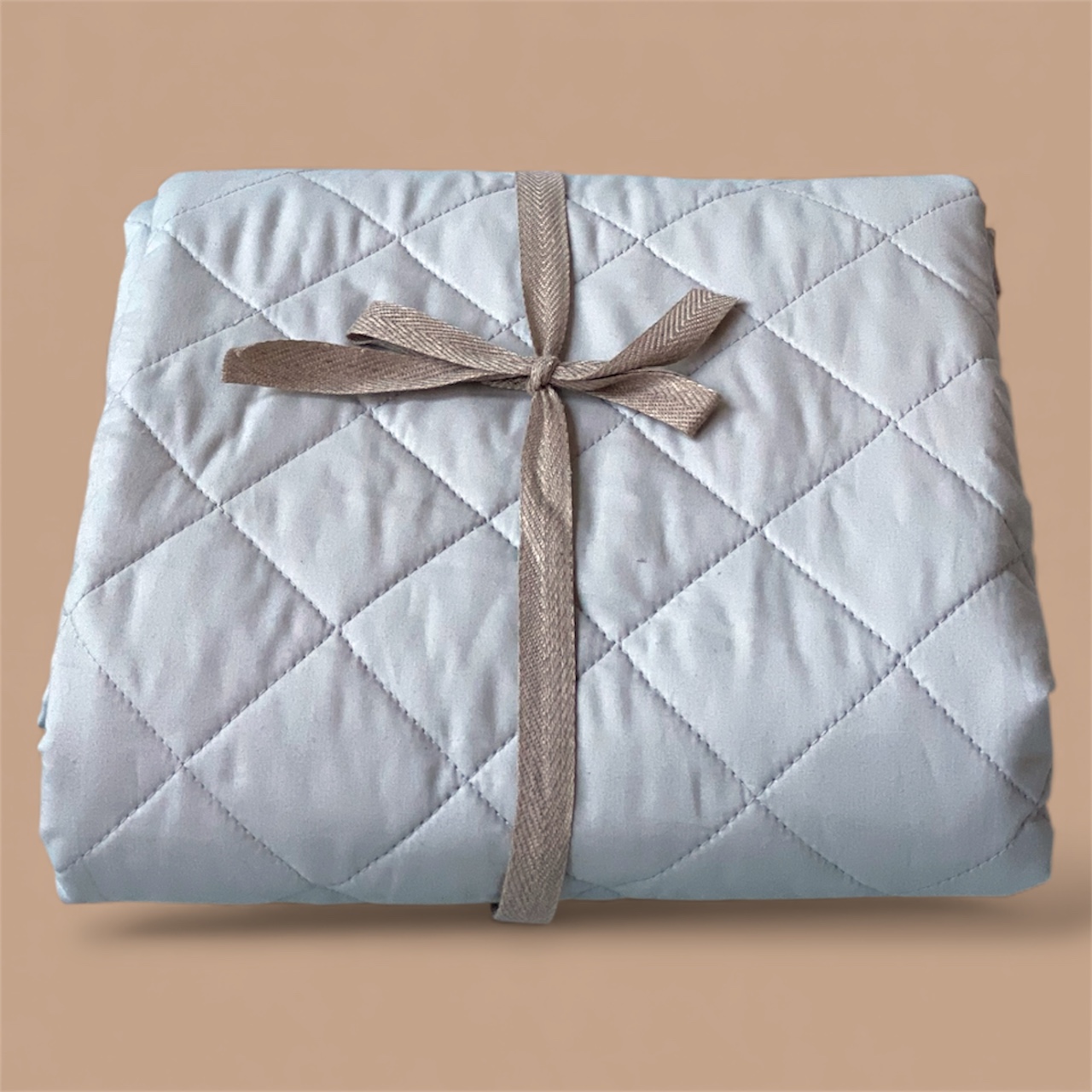 Et vattert leketeppe/quilt er et stødig underlag på gulvet eller i lekegrinden. Teppet er også fint å ha med seg på tur, som et stabilt underlag på stranden, i parken eller som sengeteppe. Både innsiden og utsiden er av myk bomull, sydd med solid percale bomullskvalitet som tåler vask etter vask. Størrelse 100×100 cm.